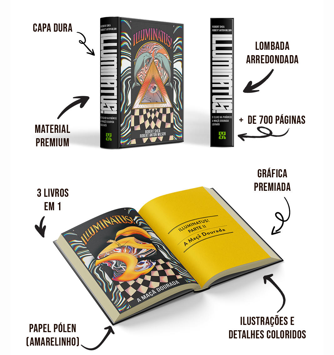 Repletos de sexo e violência — dentro e fora do espaço e do tempo — os três livros da Trilogia Illuminatus! são apenas parcialmente obras da imaginação. Eles abordam todos os encobrimentos da nossa era — desde quem realmente atirou nos Kennedys até por que há uma pirâmide na nota de um dólar — e sugerem uma verdade alucinante."